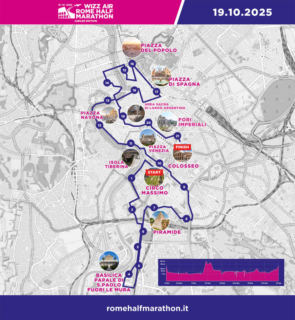 La distanza è quella canonica di 21 chilometri e 97 metri. Un percorso veloce che sta attirando runner alla ricerca del risultato cronometrico, oltre che di un’esperienza indimenticabile. Partenza da via del Circo Massimo – altezza Roseto – e arrivo su via degli Annibaldi con suggestiva vista sul Colosseo, per un traguardo che farà emozionare tutti i partecipanti, degno di un grande evento internazionale nell’anno delle celebrazioni per il Giubileo, che verrà ricordato sulla maglia ufficiale della half marathon, realizzata per il secondo anno consecutivo da adidas.